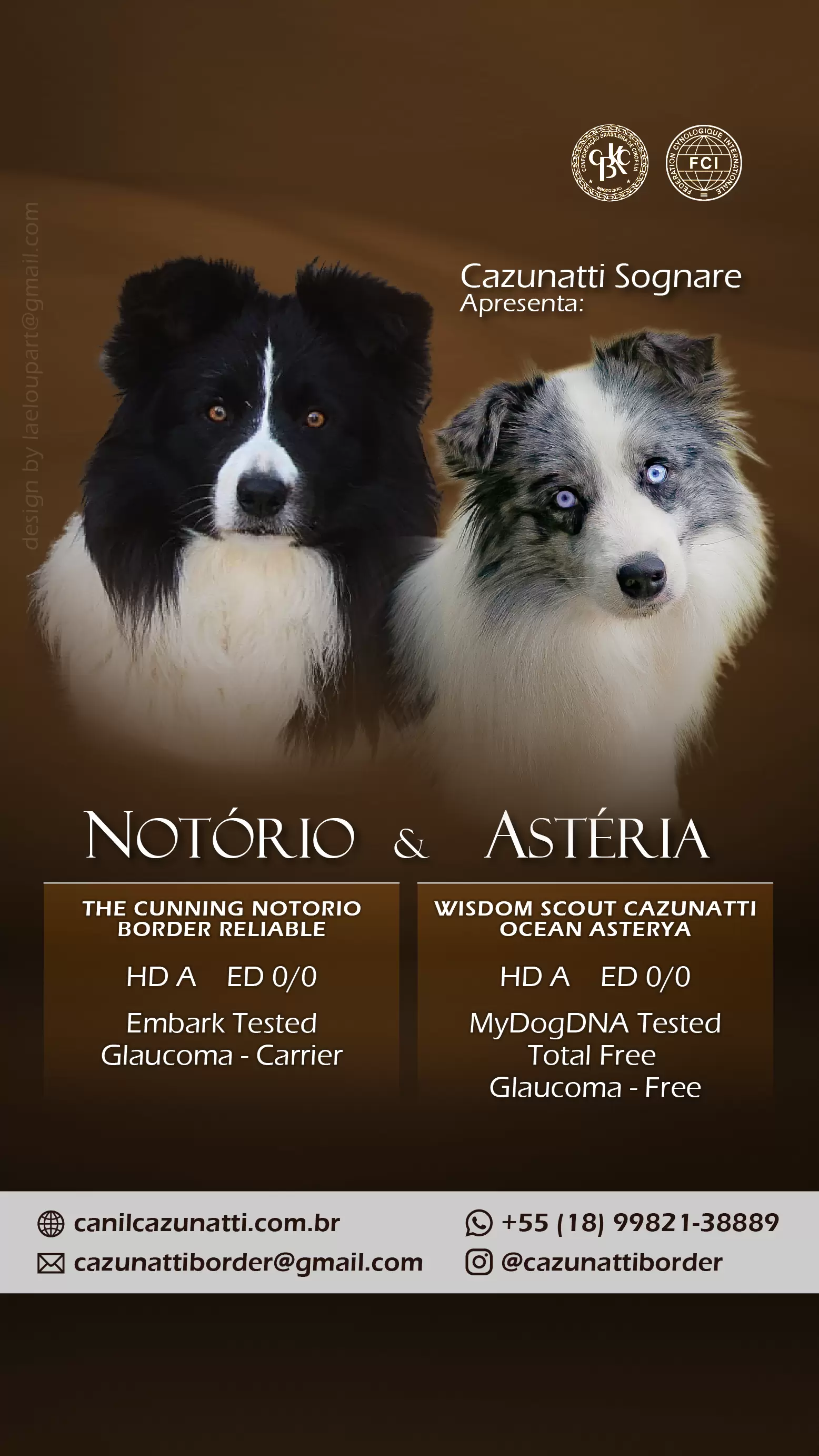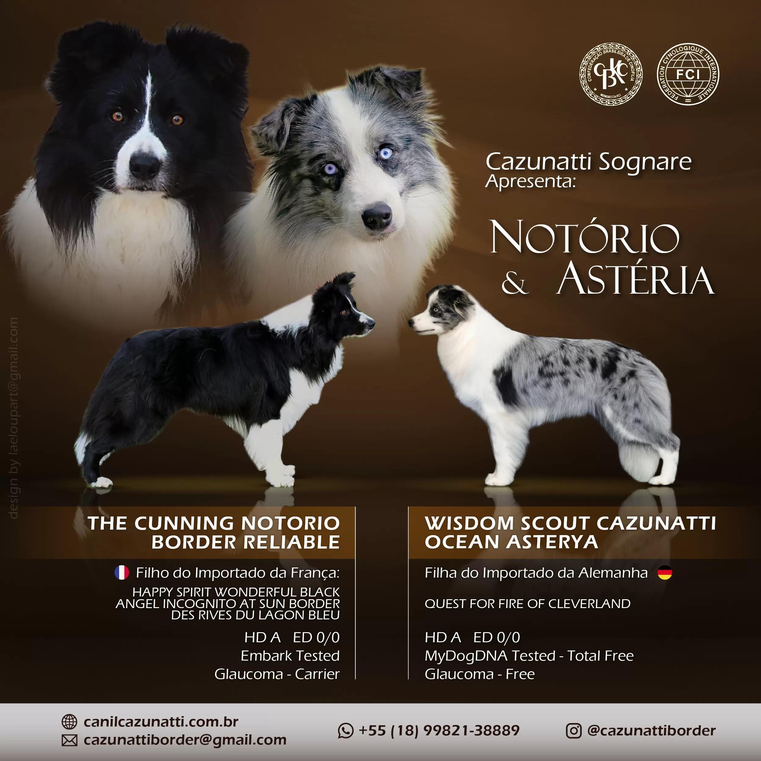 Ninhada extremamente esperada para o canil, Astéria sempre foi sonhada antes mesmo de nascer. E Notório, um cão no qual sempre me agradou muito. Tanto Astéria, quanto Notório são cães muito corretos, com excelentes angulações e proporções. Astéria é filha do maravilhoso Cyrus, importado da Alemanha do canil Cleverland. E Notório, é filho de um cão importado da França, que é mega premiado em pistas, se chama Incógnito.