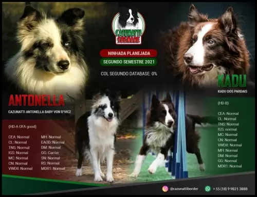 Temos grandes expectativas para esse ninhada! Antonella tem laudo de displasia coxofemoral HD-A OFA Good. Kadu, tem seu laudo de displasia coxofemoral (HD-B), de doenças genéticas Kadu é testado pelo embarkvet (Estados Unidos) e é livre de todas as doenças genéticas testadas da raça, e Antonella testada pelo My Dog Dna (Finlândia) ela é livre também para todas as doenças genéticas da raça, exceto Glaucoma, em que ela é portadora/não afetada.